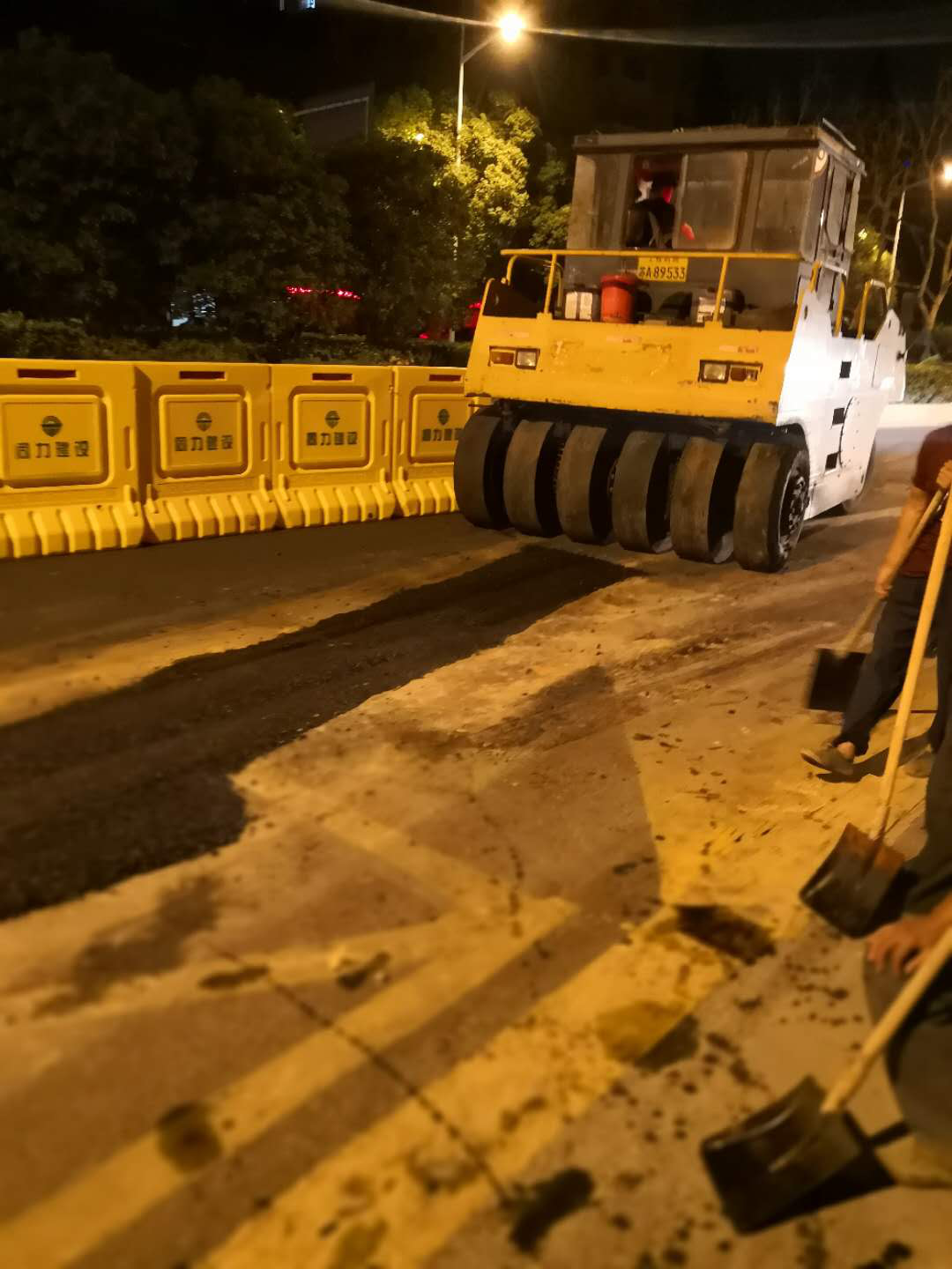 龍蟠中路整治中最大難點在于承載交通壓力大,施工時間受很大約束。首先是每日的工作時間較短,雖前期做了大量溝通工作,但鑒于龍蟠中路是城市南北向交通大動脈,施工容易造成嚴重擁堵。故最終只能在每日夜間21:00至次日凌晨6:00于進行施工,其余時段均需保證全時段無占用通行。在復雜不利的環境下,緊抓“定時清場法”、施“單元施工法”不放松,將整條道大路劃分為十六個單元以便組織推業進。每日夜間21:00圍擋設施、施工車輛等陸續進場,大批施工人員和交通疏導人員在各個單元就位,然后根據現場車流量情況試用圍擋封閉部分車道,并根據測試圍擋后車流通行效果靈活調整車道封閉時間以及車道封閉數量,在確認不會造成交通堵塞之后再圍擋施工。見縫插針、統籌協調、調整工設序,努力做到化難點為亮點。為了確保白天可以順利開放交通,提前擬定方案,將小面積難以壓實、大面積難以養生的水泥穩定碎石道路基層處理方案,調整為小面積用砼澆筑覆蓋鋼板養護、大面積病害采用ATB瀝青碎石即壓即成型的方案,既保障了交通也保證了質量。同時部署各單元作業班組集中力量在少量點位內施工,開一段干一段收一段,不多開作業面,便于控制質量和進度,同時方便組織圍擋、開放交通及白天的維護巡查;對于過路溝槽、病害處理的鋼板覆蓋措施,也有多項要求及改進。首先是確保鋼板厚度不低于2厘米,并在鋼板下放置橡膠墊,減少車輛碾壓的噪音,鋼板四周還會設置減速帶起到警示過往車輛減速以及避免鋼板發生位移,其次是對于鋼板下脫全跨度大于1米的增設槽鋼支撐,并做到24小時人員巡視不間斷。與此同時,周邊一些單位比較支持,騰出了一些空地給我們堆放材料,這樣在每天早上6點能確保圍擋和施工車輛等就近安放,恢復快車道交通。
