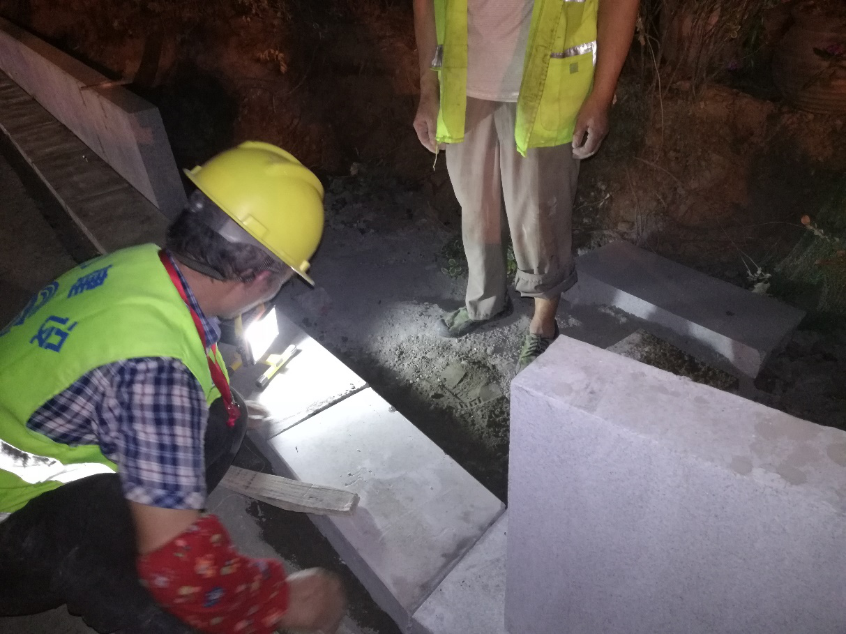 開工后外部條件復雜,名城會、中高考護考、梅雨等都大大影響了工期。開保工至今幾乎有2\3的時間無法正常施工。針對護考、重要活動保供節點等特殊時段,正一方面多方協調,盡可能爭取相對寬松的外部條件;一方面果斷調整工序,在禁運禁噪前夕組織加大力量集中實施產生道大量渣土和噪音的側平石拆除作業,并用圍擋密圍占住原側平石區域防止土方流失。確保了在護考時期可以只施工路緣石鋪貼等不產生噪音的工序。同時為了切實在護考期間將噪音降至最低,經過調研,項目部給各作業班組更換采用太陽能充電鋰電池LED燈等新型照明設備。這類新設備價格不貴,又不用燃油發動機提供電能,不僅解決了燃油發動機的噪音問題,同時移動便利也方便了施工。